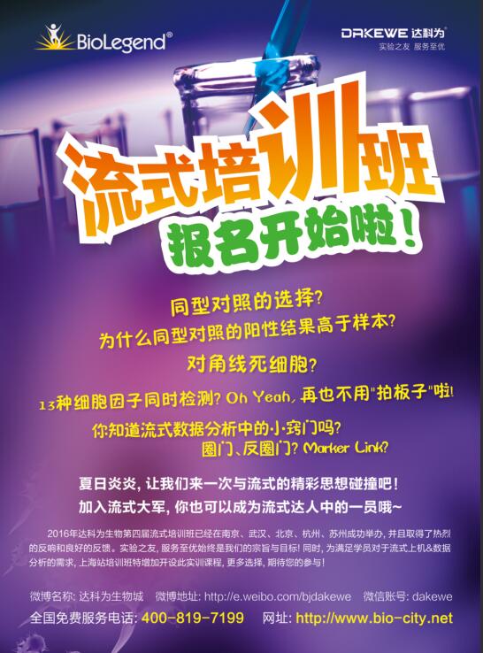 2016年達科為生物第四屆流式培訓班已經在全國各地火熱舉辦中,第七站上海培訓班經過前期的彩頁、海報的宣傳,報名工作已經接近尾聲。目前上機課程已滿,理論課程還有部分名額,感興趣的學員,歡迎報名,期待您的參與!