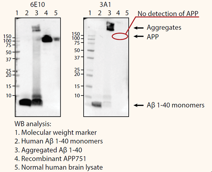 在WB實(shí)驗(yàn)中檢測克隆號3A1抗體針對人Aβ1-40單體、Aβ1-40聚集體、重組人APP751蛋白和正常人腦裂解物的特異性。與克隆號6E10抗體相反的是,3A1與APP無交叉反應(yīng)(泳道4、5)但是與Aβ1-40聚集體顯著反應(yīng)(泳道3)。與6E10相比,3A1表現(xiàn)出對Aβ1-40單體的較弱反應(yīng)性(泳道2、3)。