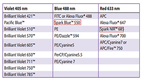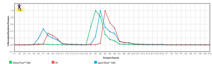 Spark Blue?550488nm藍色激光激發并在550nm處發射,介于AlexaFluor?488FITCPE的峰值發射之間。SparkBlue?550的亮度與FITC相當。405nm紫外激光可以進一步增加這幾種熒光不互相混合的情況。