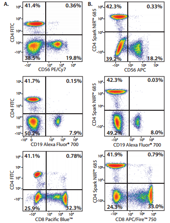 來自相同供體的全血用圖AB配色方案染色。A包括抗人CD4-FITC、CD19-Alexa Fluor700CD8-PacificBlue TMCD3-PE以及CD56-PE-Cy7的抗體。B包括抗人CD4-Spark NIR TM685、CD19-AlexaFluor 700、CD8-APC-FireTM 750、CD3-PE以及CD56-APC的抗體。