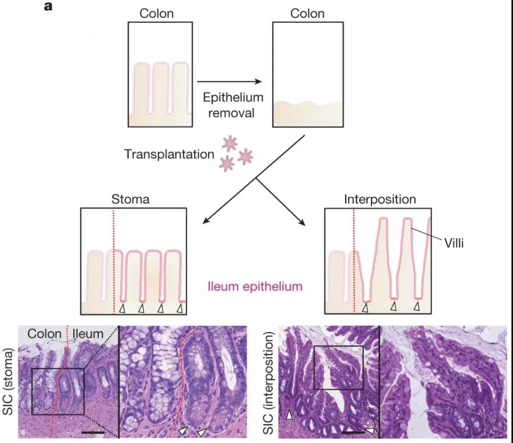通過上皮置換產生SIC的策略。頂部,結腸上皮被去除(EDTA處理),然后回腸類器官被移植。在進行介入手術之前,移植的回腸上皮顯示出隱窩狀結構(左下圖和圖像)。移植后,會形成絨毛狀結構(右下圖和圖像)。白色箭頭表示潘氏細胞。