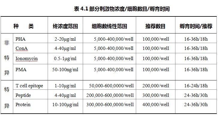 不論是普通多肽(比如重疊多肽庫)還是蛋白質(zhì)或者蛋白類的組織提取物,這些刺激物都需要APC的攝取、內(nèi)化、加工、呈遞,之后T細胞才能被刺激。所以,使用這些刺激物的時候,一定要保證足夠的細胞密度。根據(jù)我們的經(jīng)驗,細胞密度要至少達到20萬-30萬每孔。多肽推薦的細胞密度為30萬/孔,蛋白推薦的細胞密度為40萬/孔。也可以根據(jù)實際情況,在線性范圍內(nèi)調(diào)整,參見表4.1與圖4.2。