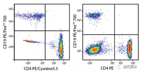 在5激光Cytek? Aurora 光譜流式平臺上,檢測人裂紅后外周血的CD4和CD19。PE/Fire? 700-CD19和PE/Cyanine5.5-CD4共染方案與PE/Fire? 700-CD19和PE-CD4共染方案得到了相似得陽性信號,說明在光譜流式平臺PE/Fire? 700和PE/Cyanine5.5是有可能在一個panel中共用的,但是配色方案可以更加優化。