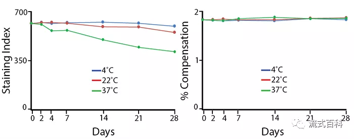 將PE/Fire? 700標記的抗體分裝后分別保存在4℃、22℃和37℃下。穩定性可以根據抗體的染色指數(staining index)和熒光補償百分比來衡量,隨著保存時間的延長,3種溫度保存條件下光補償百分數并沒有發生改變,但是37℃的保存條件染色指數下降了約36%,22℃保存條件的染色指數下降了約12%,這主要是由于這兩種保存條件下抗體的非特異性染色背景升高引起的(檢測平臺為5激光Cytek? Aurora 光譜流式)。