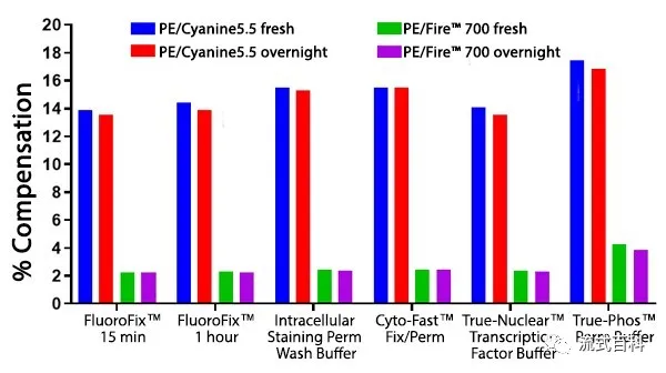 PE/Fire? 700 和PE/Cyanine5.5標記的兩種CD4抗體檢測人裂紅外周血,抗體孵育完成后在固定洗滌馬上去檢測條件下和過夜后的條件下,在5激光Cytek? Aurora 光譜流式平臺檢測,PE/Fire? 700 在不同的實驗方案中對多聚甲醛的固定具有穩定的抗性,表現出比PE/Cyanine5.5更優秀的穩定性,但是在磷酸化指標的檢測方案中,PE/Fire? 700熒光素的穩定性出現了一定程度的下降。