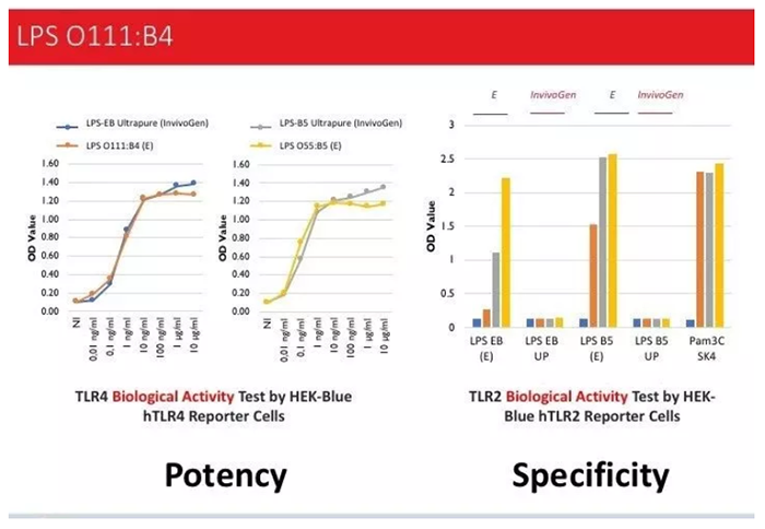 比較InvivoGen和E品牌TLR4特異性LPS(Utrapure)發(fā)現(xiàn),E品牌雖然號(hào)稱TLR4 specific agonist,但是可同時(shí)激活TLR2和TLR4,而InvivoGen的Ultrapure LPS只能特異性激活TLR4。